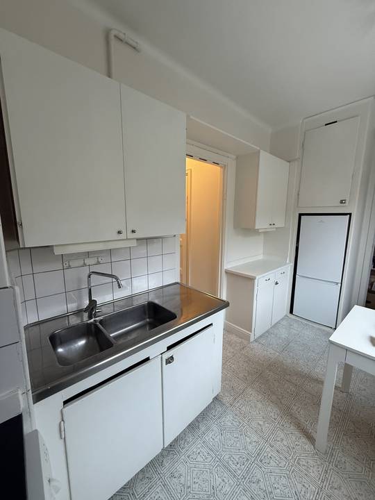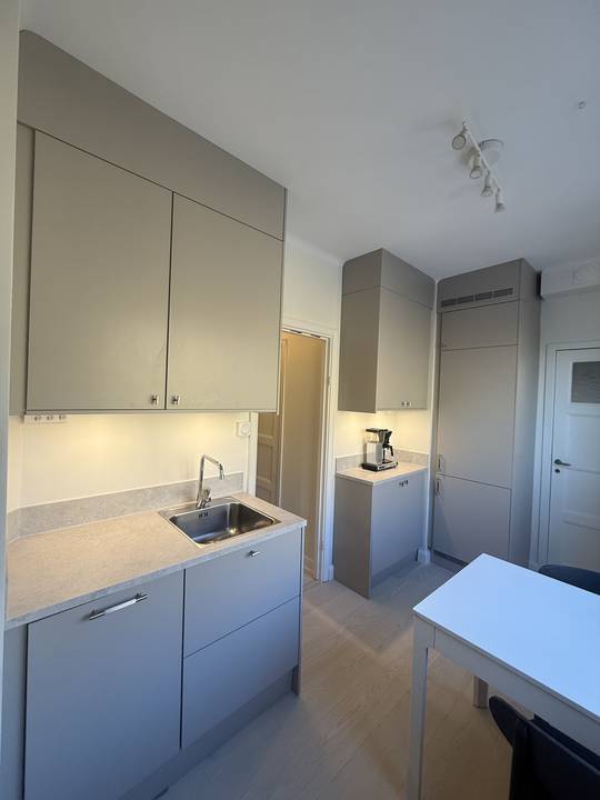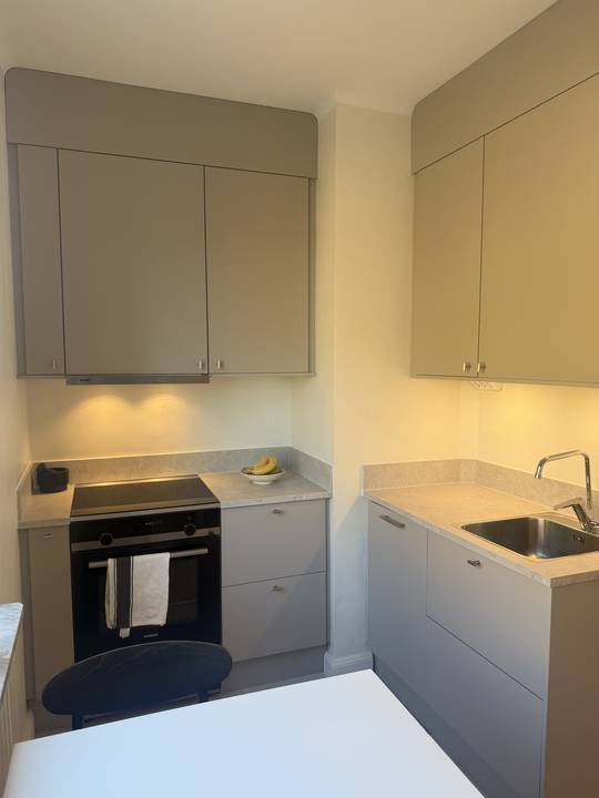 Rev ut ett gammalt kök som saknade mycket funktioner tex fläkt och förvaring. Reparerade väggar och golv för att kunna sätta in nytt kök. La in nytt ekparkett som blev superfint. Sedan sattes det in ett fint Epoqkök med fläkt, diskmaskin, integrerad kyl&frys med takanslutning. Hittade även golvlister som matchade resten av lägenheten där det är 30-tal stil. . Resultatet blev supersnyggt. Mycket nöjd med hur effektivt allt gick och blev precis som jag tänkte mig.