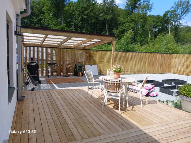 Här har vi byggt en altan och ramat in uteplatsen med ett högt staket, samt ett skärmtak över grillen