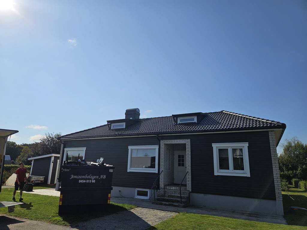 Här har vi bytt takbeklädnad samt ny takpapp, läkt , hängrännor och plåtdetaljer