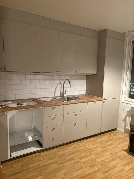 Här har vi byggt ett IKEA kök med mått beställda passbitar och luckor. ✨ Vi har också monterat en mått beställd stenskiva.🗿 Golvet har vi bytt några plankor sedan slipat och lackat!